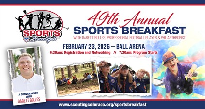 Come join Scouting Colorado for our 49th Annual Fundraising Sports Breakfast! Meet with guest speaker, and Eagle Scout, Garett Bolles, network, and see Scouting in action. Hear testimonies from Garett and Scouts on February 23rd 6:30 am at Ball Arena.